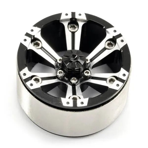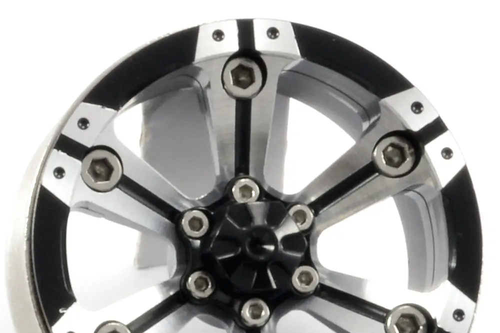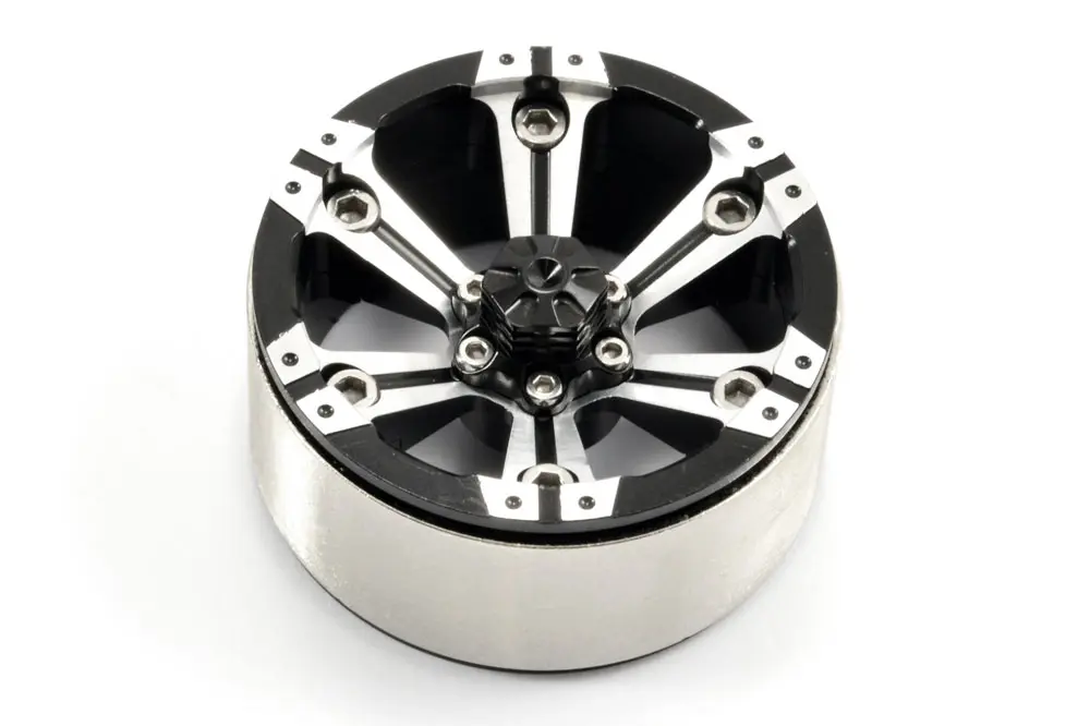 Suitable for most popular 1/10th scale crawlers with a 12mm Hex fitment, these all aluminium 1.9” sized, 3-piece beadloc wheels are the ultimate finish to any scale rig. Featuring a black anodised and machined face, these 6-spoke wheels mirror the aggressive styling of full size all terrain designs. Once mounted on your rig a bolted centre cap hides your wheel nut and axle assembly for a truly stunning finish. Furthermore the heavy centre ring adds much needed weight on all four corners to keep your chassis on the ground and ready to drive up and over any terrain.