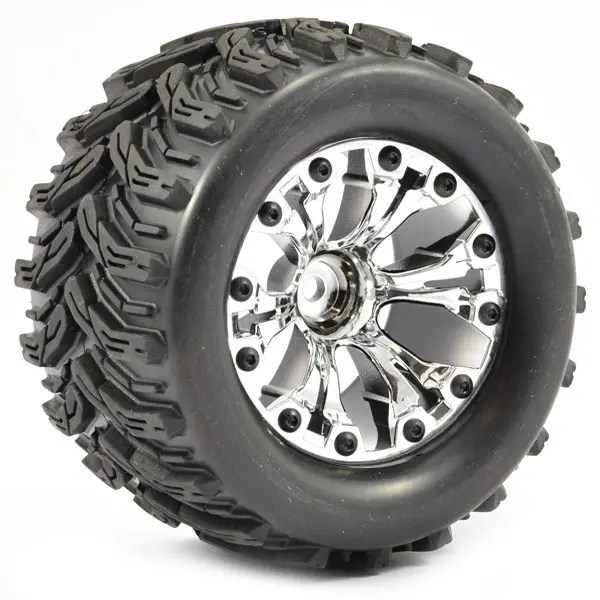 Suitable for most 1:10 Monster trucks with 12mm Hex fit and 5mm axle. Sold as pair. (Chrome only)