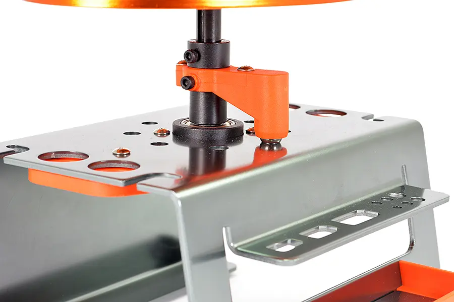 Either side features a shock building station for supporting shocks via shafts or shock bodies. A mounted rotating moulded jig accomodates 11, 13 and 17mm sized shock bodies.