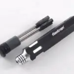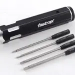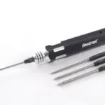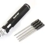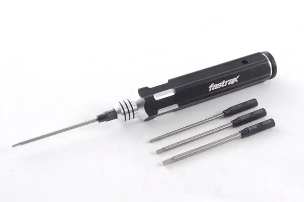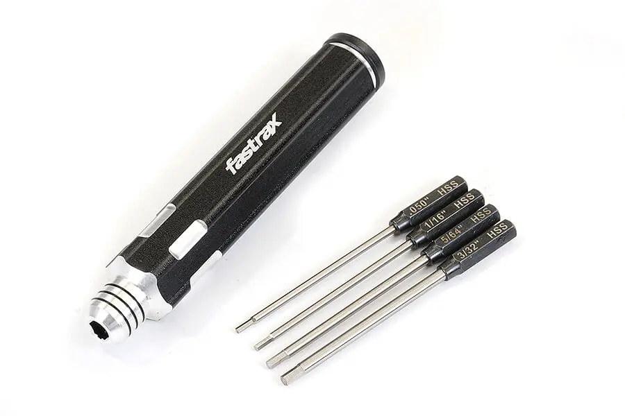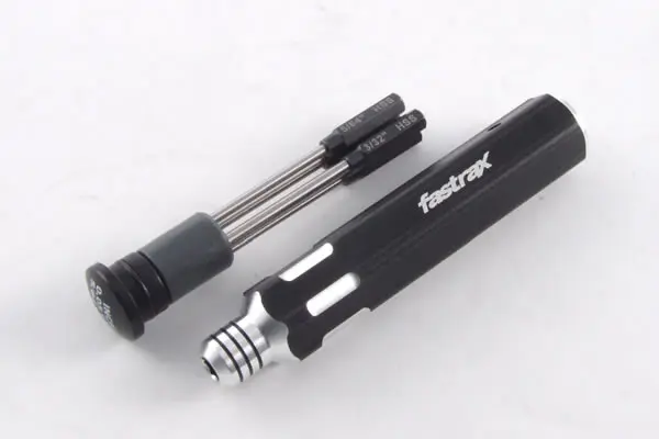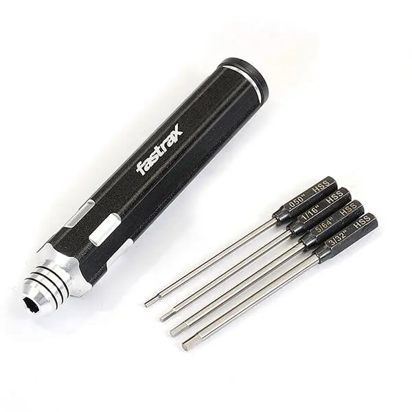 One handle, four wrenches! This space saving tool is ideal for those not wishing to cart the tool box around. The hollow aluminium handle houses .050″, 1.16″, 5/64″ and 3/32″ hex wrench bits. Simply select the one you want and slide into the spring clamp holder in the end.