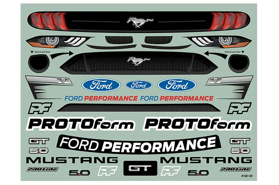 This Mustang is formed from durable 1.5mm thick high-quality polycarbonate with paint-then-peel overspray film, and it also includes a detailed decal sheet and wing mounting hardware. This body was designed with wider rear fenders as a direct fit for the Felony™ to clear the 53/107 tires. It will work with Infraction™ rear tires, but to get the optimal look and fit, you can optionally choose to either widen the rear of your Infraction™ chassis with stock rear tires or use Felony™ rear tires with modifications to the rear gear ratio. See the fits tab for the list of parts needed for these modifications.