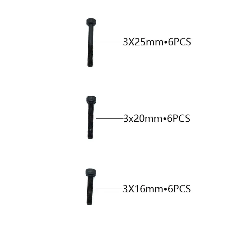 Replacement cap head screw set for Rlaarlo on-road models. Sizes include M3*16mm, M3*20mm and M3*25mm. Set contains 6 of each screw. Part number R10099.