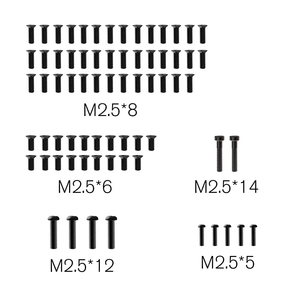 Replacement oval screw set to fit the Rlaarlo ROG1 and X12S. Includes the following sizes: M2.5x14mm, M2.5x12mm, M2.5×6, and M2.5x5mm. Part number R16063.