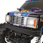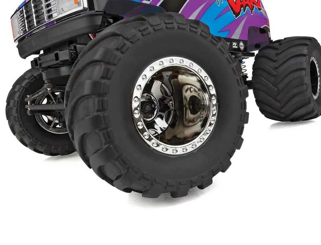 Designed not only for scale looks with realistic chrome wheels, chevron-style tires, and retro-styled van body, the MT12 is built for car-stomping action as well. The steel ladder frame chassis provides the perfect backbone for this rugged little monster. The 4-link suspension, threaded shocks, and soft rubber tires give the grip and performance needed to smash over cars or through dirt and mud. Transferring power to the ground is a compact 3-gear transmission, plastic low-friction slider-type drive shafts, front steel CVA axles, and metal-shield ball bearings.