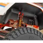 Threaded Aluminum shock bodies: Threaded gold anodized aluminum and fluid-filled, these shocks keep the vehicle stable on the trail and retain oil even in the roughest terrain.