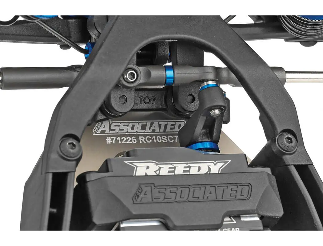 The RC10SC7 shares key components with the RC10B7 and RC10B7D Team Kits, making it easier than ever to run multiple classes at the same time. The primary suspension update is to lower the CG with shorter 25mm long front and 31mm long rear 13mm big bore shocks. The new chassis design is a stronger short course version of the RC10B7 buggy design and gets a new gull wing long arm suspension to improve grip and predictability in all conditions. On top of that, the kit includes updated zero KPI steering blocks and updated caster blocks, along with the legacy B7 features for tuning the front-end feel. The new steel front inner hinge pin brace and updated B7 V2 caster block add to front end durability. The new RC10SC7 offers the same mounting locations along with anti-roll bar hardware as the RC10B7 while pairing nicely with wide mount anti-roll bars that fit the new suspension arms.