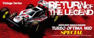 The Optima Mid is remembered for its brilliant debut at the 2nd World Electric Off-Road Car Championships in England 1987, where the prototype occupied 5 out of the 10 qualifiers in the A-Main final and finished in second place. Optima’s chassis layout with midship motor position and undercarriage grew in popularity and became the foundation for modern racing buggies. It is this Optima Mid that will be reproduced as the 10th model in the Kyosho vintage series. The main chassis is made from 6016T6 aluminum alloy that guarantees high rigidity. Each component of the car has been updated to match a modern power system, such as the 48-pitch gear for improved efficiency and precision gear ratio setting. The recreated Optima Mid also features adjustable belt tension using a tensioner not available at the time, ultimately achieving a smooth drive with minimal loss. Furthermore, equipment from the Turbo Optima Mid such as the FRP front and rear shock stays, and countersunk main chassis have also been incorporated into this model. The racy form of the original Optima Mid body design is faithfully reproduced in line with the popular vintage series. Experience the driving spirit of the Optima Mid incorporating the state-of-the-art mechanics from the past that cannot be matched by anything today.