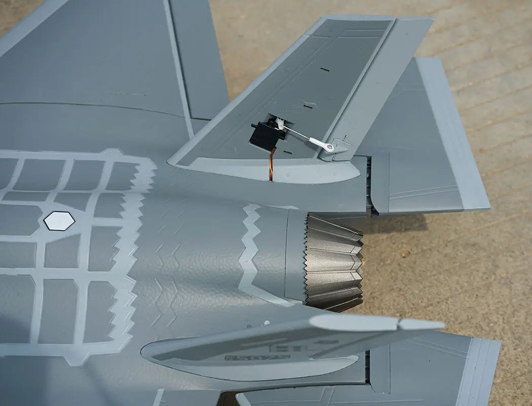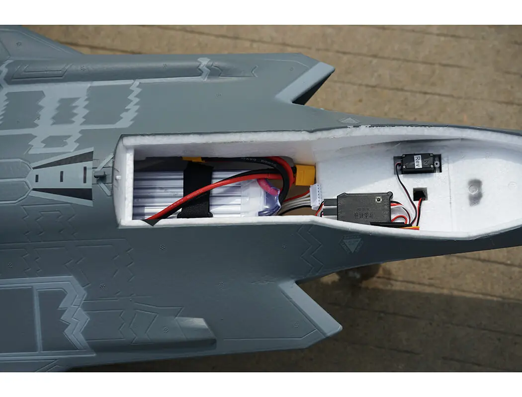 This hand launch model does not have a CNC landing gear system but still features the same high-performance 6S 64mm EDF system, paired with a 50A ESC with thrust reversing, deliver plenty of power and impressive sound effect. With full flying horizontal stabilizers, the F-35 is capable of aerobatic manoeuvres including rolls and loops. Spacious battery bay fits 6S 3300-5200mAh LiPo battery for extended flight times.